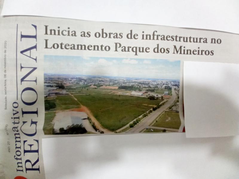 VENDA DE TERRENOS JUNTO AO LOTEAMENTO ZANETTE (LOTEAMENTO PARQUE DOS MINEIROS), COM LOCALIZAÇÃO PRIVILEGIADA, NO MELHOR PONTO DE SOLEDADE, COM VALORIZAÇÃO GARANTIDA. ENTRADA PRINCIPAL DA CIDADE. MELHOR PREÇO E CONDIÇÕES ACESSÍVEIS DE PAGAMENTO. CONTATE-NOS PELO FONE/WHATS: 54-99616-8990 (Corretor Sebben). São aproximadamente 140 terrenos a venda). JA COM APROVAÇÃO DA FEPAM E LICENÇA DE INSTALAÇÃO. VALORES A PARTIR DE R$ 70.000,00.